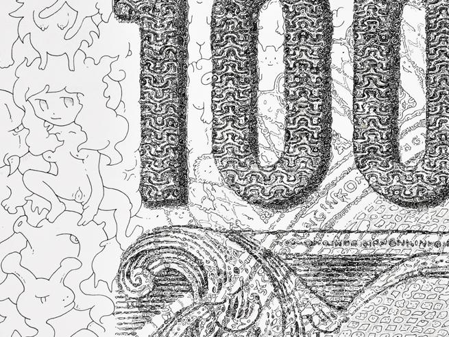 千円札のイメージをキャラクターの集合体によって再現したこの作品は、アーティスト赤瀬川原平(1937-2014)の『復讐の形態学(殺す前に相手をよく見る)』という作品のオマージュとして制作した。『復讐の~』は当時流通していた聖徳太子千円札を三六判(約180×90cm)程度の大きさに拡大し、ペンで模写した作品で(私の千円札のサイズはこの作品に合わせている)、有名な千円札裁判を巻き起こした原寸大模造千円札の源流にあたる美術史的にも重要な作品である。赤瀬川氏は千円札を執拗に観察し緻密に模写することで、権力の象徴としての紙幣というものの価値を殺そうとした。しかし約半世紀が経過した今日では、キャッシュレスや仮想通貨の台頭によって、紙幣の象徴性や神話性は既に死んでいるとも言える。死んでしまった千円札を私の制作スタイルでリプロダクトし(解剖し埋葬する)、赤瀬川版千円札と対比させることによって、時代の変化による紙幣価値の移り変わりを描出しようと試みた。副題のIt's Only a Paper Moonは90年近く前のアメリカの流行曲から拝借。天下の回り物と言われるように人や社会の周りを回り巡っている貨幣を地球の周りを公転する月に見立てた。まさに紙幣とは紙の月ということになるであろう。 |
