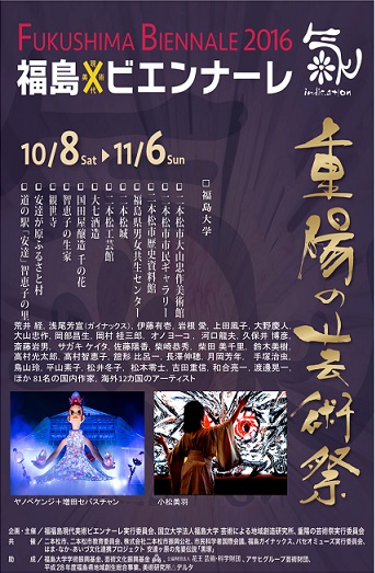 "FUKUSHIMA BIENNALE 2016" 【Period】October 8-November 6, 2016 【Venue】Chuusaku Oyama museum of art, historical museum, Nihonmatsu castle, Fukushima Gender Equality Centre, Chieko's birthplace, Adachigahara Furusato-mura, etc |